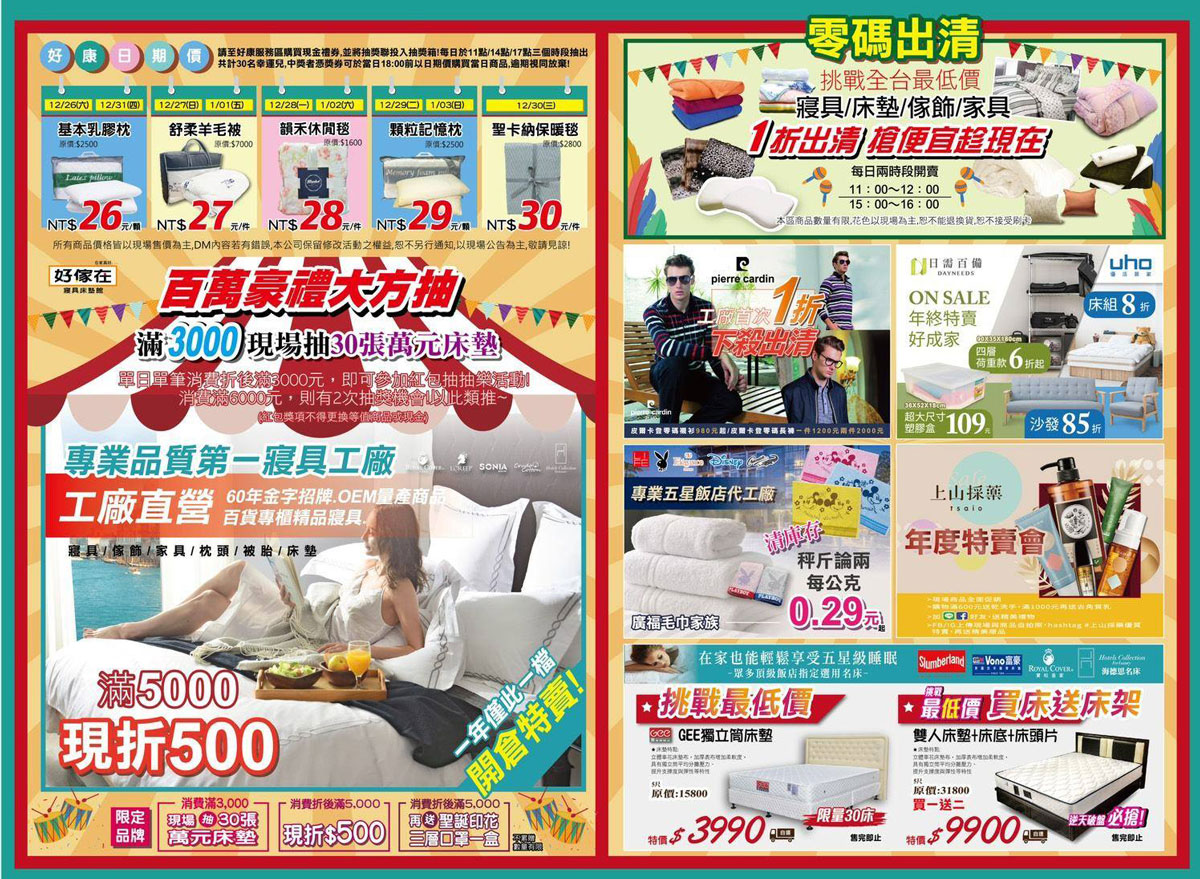 好傢在彰化特賣會 廠拍嘉年華日期 2020/12/26~2021/01/03 活動僅有短短九天,特賣會的現場從枕頭、被套、床包、床罩、床墊、男裝、生活用品、毛巾、保養品、鞋子、內衣...等,家中的大小傢俱生活配件應有盡有,除了各種千元有找的蠶絲被、羊毛被、羽絨被外,只要滿$3000現抽30張萬元床墊、滿5000現折500、折後滿$5000再送聖誕限定口罩一盒、還有NG及零碼品限時出清、每日限量排隊商品、好康日期價商品,優惠再優惠真的是不買可惜!